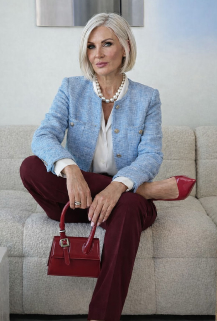 This stylish business outfit combines a light blue tailored blazer with elegant burgundy pants for a polished and professional look. A classic white blouse and pearl necklace add timeless sophistication, while burgundy heels and a structured handbag complete the outfit. Perfect for office days, meetings, and professional settings.
