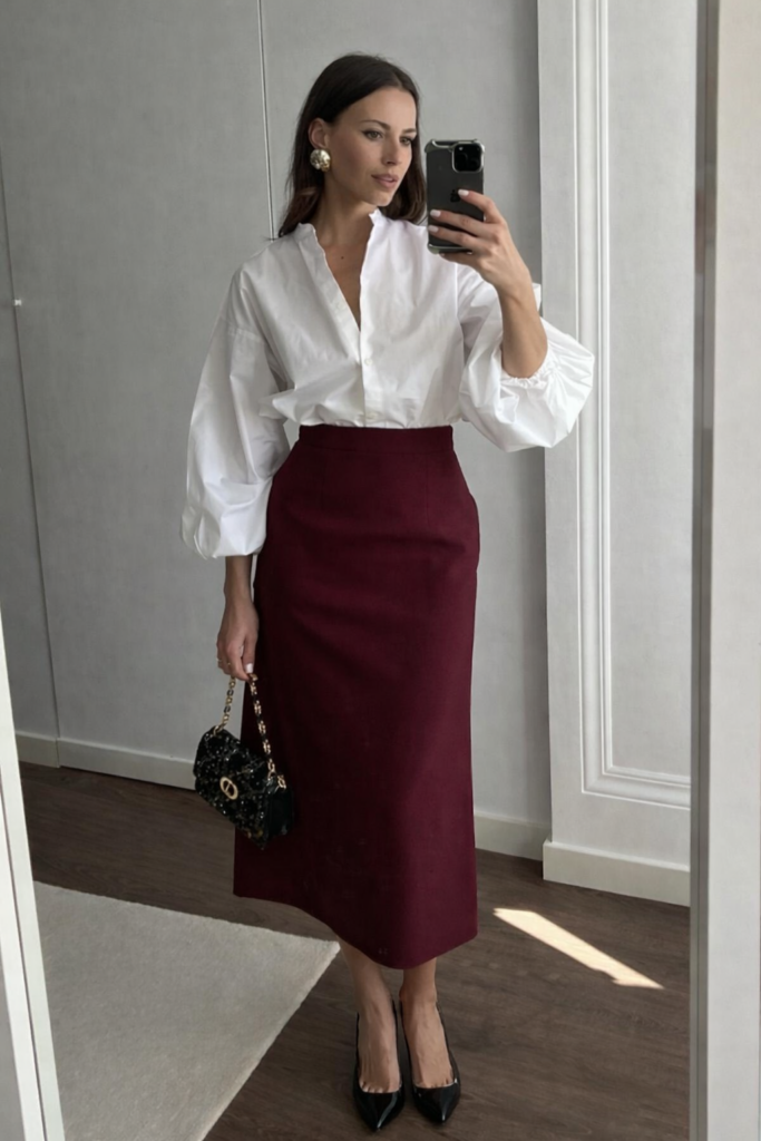 This business outfit pairs a crisp white blouse with a classic burgundy midi skirt for a polished and feminine office look. Black pointed heels and a small structured handbag add elegance, making this outfit perfect for business meetings, office days, or professional events.