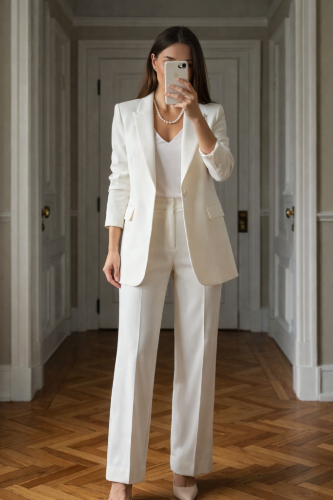 This chic all-white business outfit features a tailored blazer paired with classic straight-leg trousers and a simple white top. The monochrome look creates a clean, sophisticated style that feels modern and professional. Nude pumps and pearl jewelry add a timeless and elegant finishing touch.
