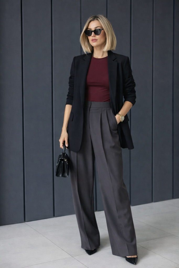 This stylish business outfit combines a classic black blazer with elegant wide-leg trousers and a deep burgundy top. The tailored silhouette creates a confident and professional look, while black heels and a structured handbag add a polished finishing touch. Perfect for office days, meetings, or business events.