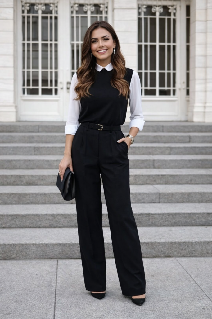 This timeless business outfit features a white collared blouse layered under a sleek black top, paired with elegant black tailored trousers. The monochrome combination creates a polished and professional look perfect for office days, meetings, and business events.